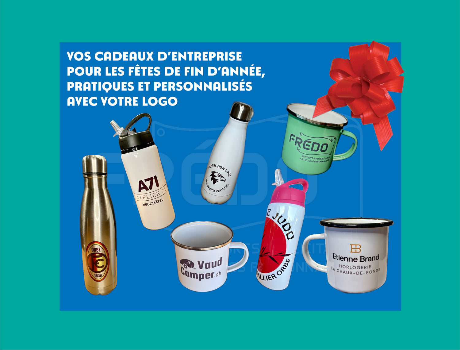 Pour les fêtes de fin d'année, optez pour un cadeau pratique et personnalisé avec votre logo. Les tasses en métal émaillé, Bouteilles isothermes et Gourdes en alu feront à coup sûre plaisir à vos fournisseurs, partenaires, clients ou employés. Un petit cadeau pratique qui ne finira pas oublié dans un tiroir ou à prendre la poussière dans un coin.