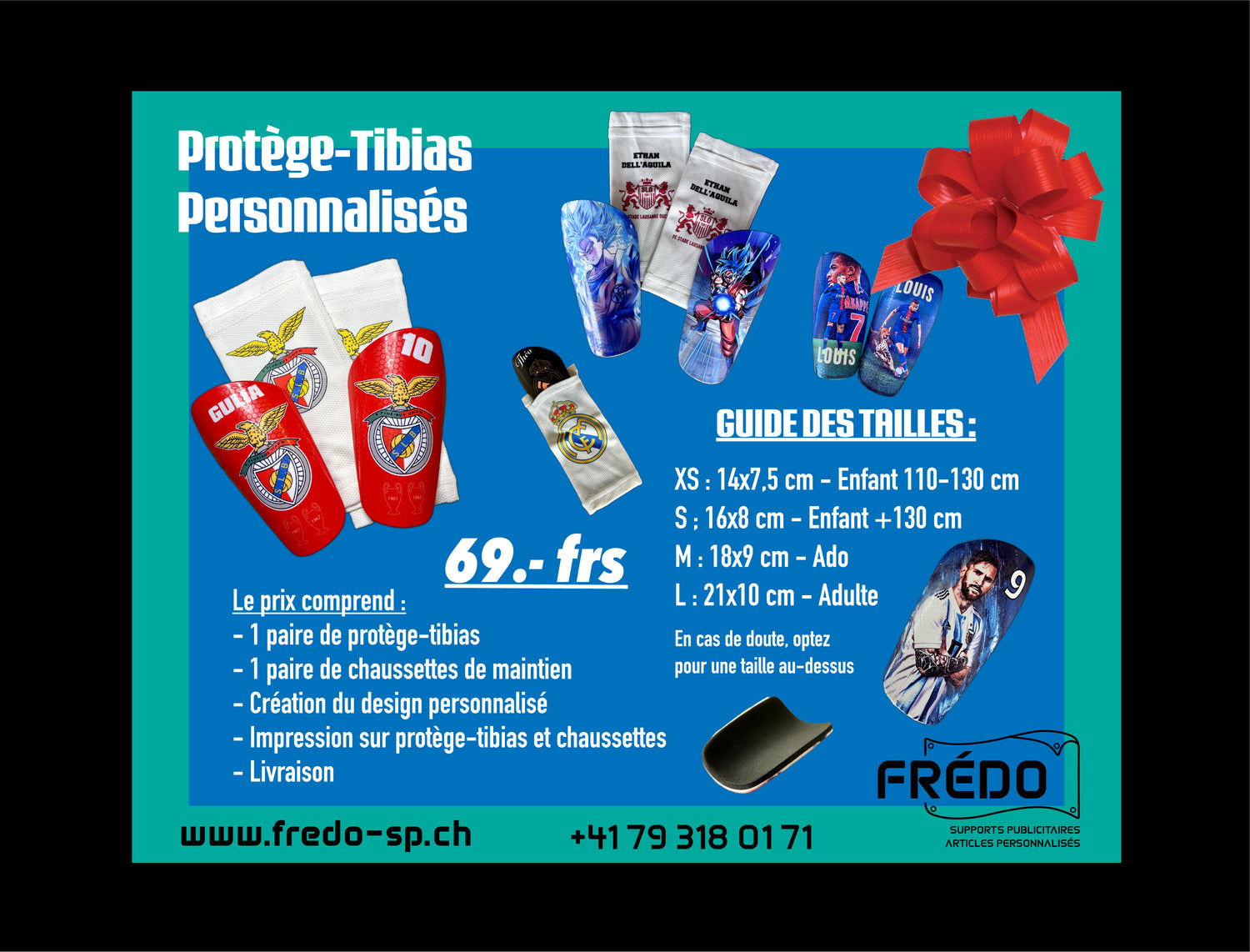 Offrez une paire de protège-tibias 100% personnalisées pour Noël à vos footeux-euses. Personnalisez les 2 protèges différemment ou à l'identique, avec le logo d'un club, aux couleurs du club ou du pays de votre choix, avec un prénom ou un numéro de maillot et même avec des photos ou images de votre choix. Possibilité également de personnaliser la paire de chaussettes de maintien.