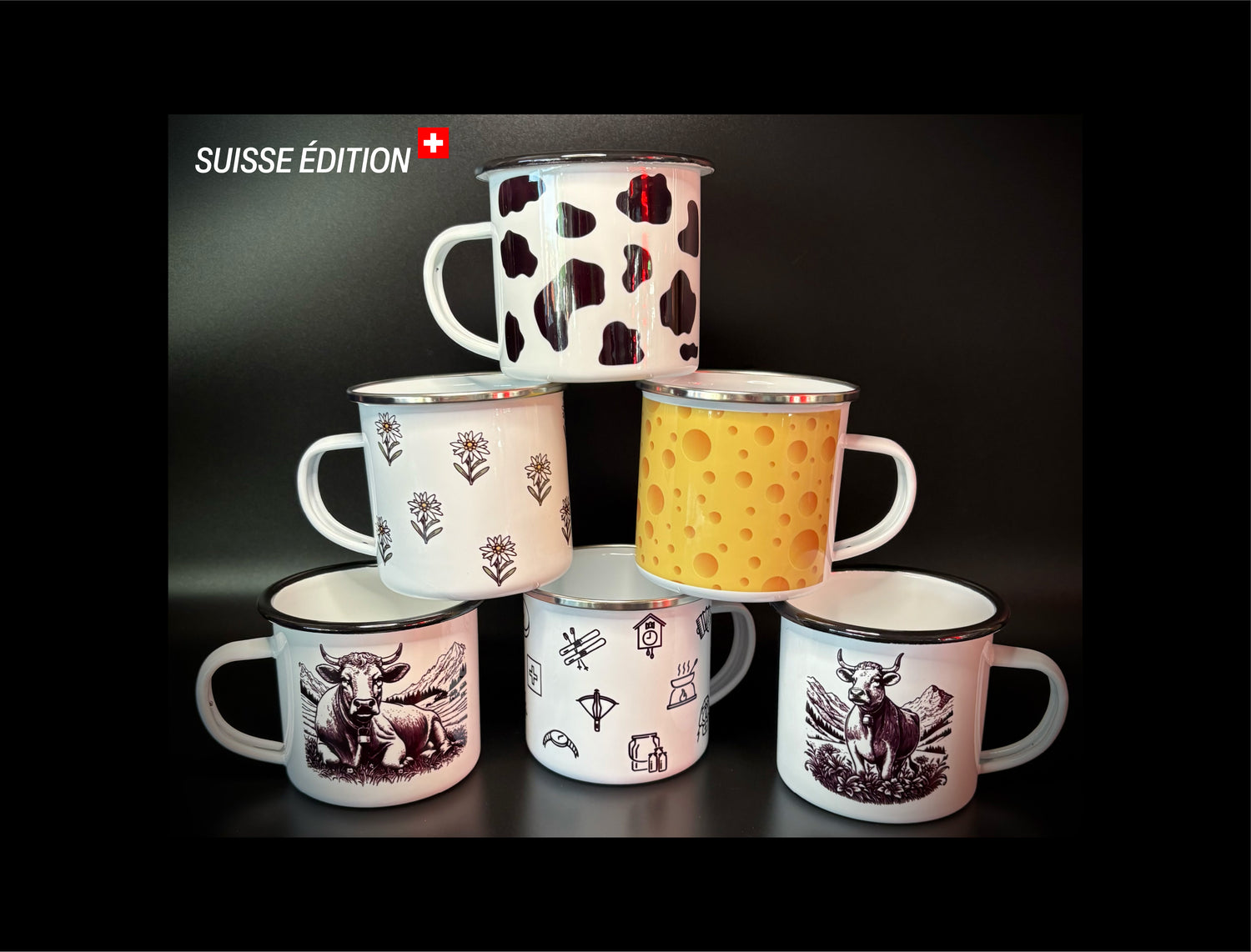 Plusieurs designs dans un style Suisse (vaches, fromage, edelweiss, pictogrammes) issus de ma création. Ces tasses seront disponibles à l'achat lors de la traditionnelle vente de sapins de Noël qui se tiendra du 22.11 au 21.12 2025 à Mollie-margot, chez l'entreprise J-C Parisod Paysagiste SA. Vous avez également la possibilité de me commander ces tasses en me contactant directement. "Attention au délai pour vos commandes".